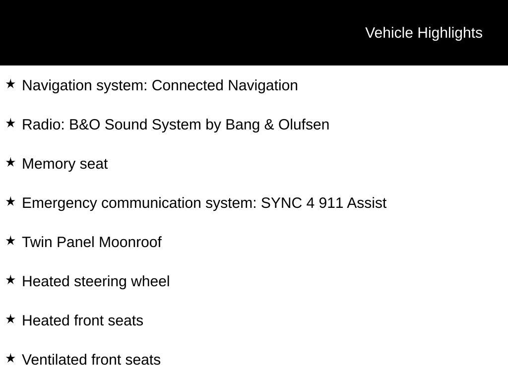 - Radio: B&O Sound System by Bang & Olufsen -inc: HD Radio, SiriusXM w/360L and 8 speakers including subwoofer, Note: includes a three (3)-month prepaid subscription, Service is not available in Alaska and Hawaii, Note: all SiriusXM services require a subscription, sold separately by SiriusXM after the trial period, Your SiriusXM service will automatically stop at the end of your trial unless you decide to subscribe, If you decide to continue service, the subscription plan chosen will automatically renew and be charged according to your chosen payment method at the then-current rates, Fees and taxes apply, See the SiriusXM customer agreement & privacy policy at http://www.siriusxm.com/ www.siriusxm.com for full terms and how to cancel, which includes online methods or calling 1-866-635-2349, Available in the 48 contiguous United States, D.C, and Puerto Rico (w/coverage limits and capable receiver), Visit http://www.siriusxm.com/FAQS for most current service area information, Availability of some services and features is subject to device capabilities and location restrictions, All fees, content and features are subject to change, SiriusXM, Pandora and all related logos are trademarks of Sirius XM Radio Inc, and its respective subsidiaries